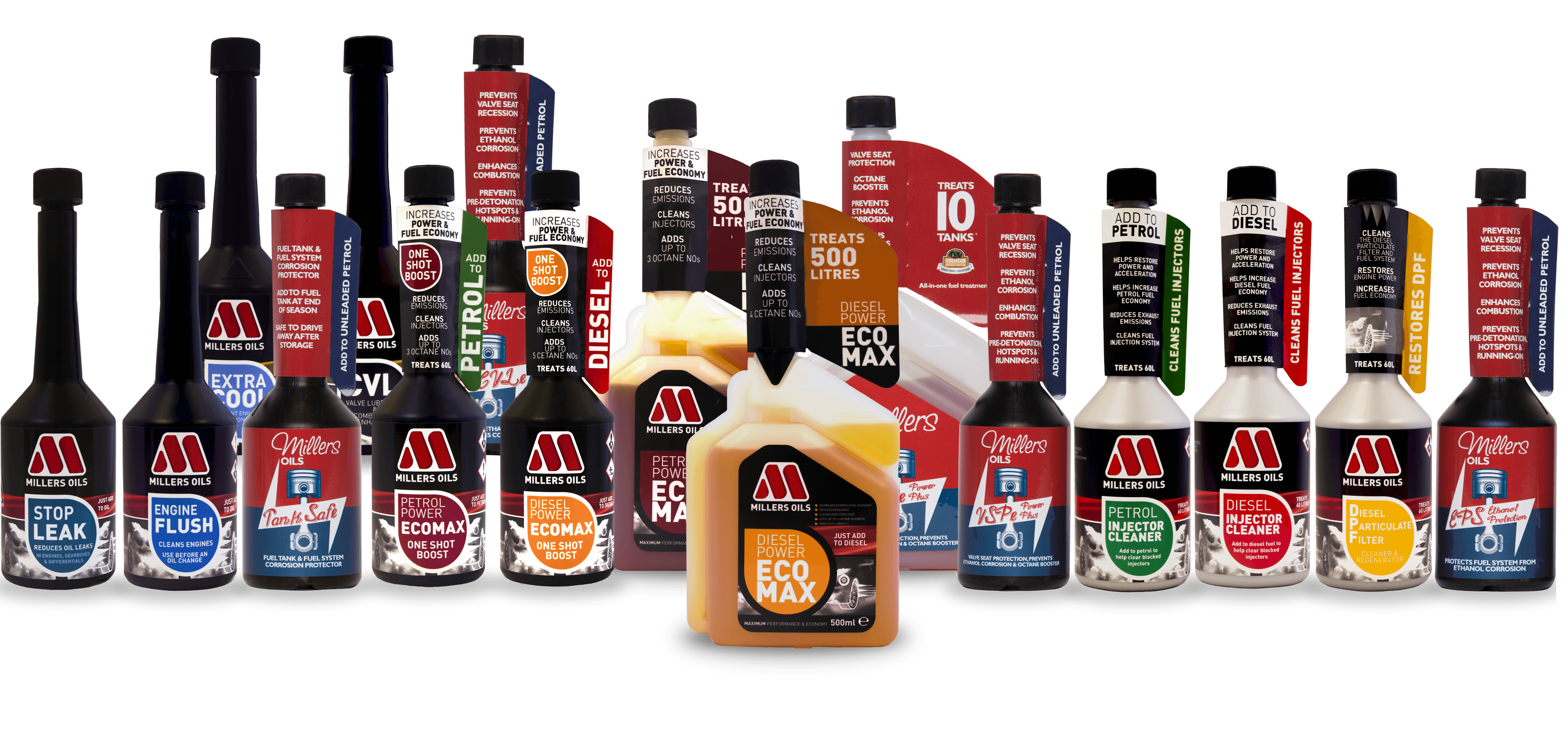 A Millers Oils rendkívül strukturált kínálattal rendelkezik, mely minden műszaki és személyes igényt figyelembe vesz, ebből adódóan nem része a kínálatnak olyan üzemanyagadalék, mely használható lenne benzines- és diesel jáműbe egyaránt.