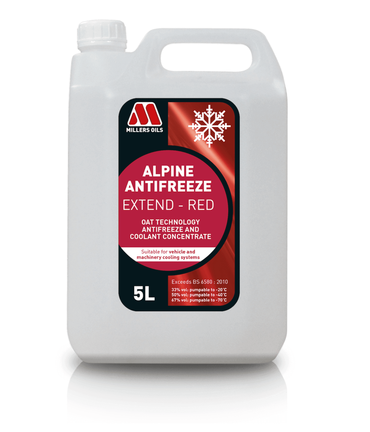 Az Alpine Antifreeze Extend Red 50% egy piros színű, felhasználásra kész, etilén-glikol alapú fagyálló és hűtőfolyadék, amely egész évben használható minden belső égésű motor hűtőrendszerében. Szerves sav alapú, úgynevezett OAT (organic acid technology) technológiával készül. Ez a termék nem tartalmaz nitrátokat, aminokat, foszfátokat, bór származékokat, szilikátokat és más ásványi adalékanyagokat.